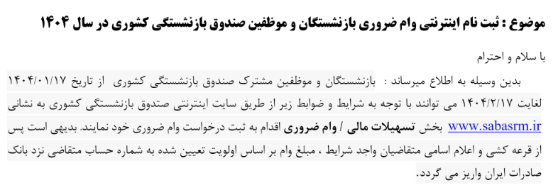 ثبت نام اینترنتی وام ضروری بازنشستگان و موظفین صندوق بازنشستگی کشوری ۲۰ فروردین ۱۴۰۴ | ۱۱:۵۹ کد : ۵۰۶۴۱ اطلاعیه ارسال به دیگران نام شما ایمیل شما ایمیل دریافتکننده ارسال انصراف تعداد بازدید:۴۳۳۷ ثبت نام اینترنتی وام ضروری بازنشستگان و موظفین صندوق بازنشستگی کشوری