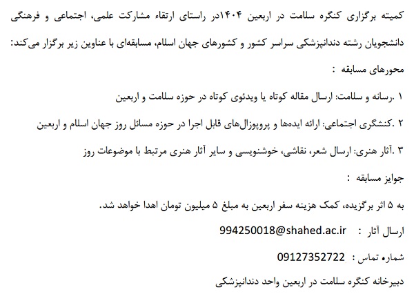 با توجه به برگزاری پنجمین کنگره بین المللی سلامت در اربعین ، مسابقه کمیته علمی دندانپزشکی به شرح زیر برگزار می گردد.