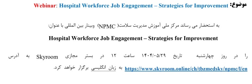 وبینار آموزشی بین المللی Hospital Workforce Job Engagement – Strategies for Improvement ۲۹ مرداد ۱۴۰۴ | ۱۰:۰۱ کد : ۵۳۹۲۵ اطلاعیه ارسال به دیگران نام شما ایمیل شما ایمیل دریافتکننده ارسال انصراف تعداد بازدید:۱۵۸۶ وبینار آموزشی بین المللی Hospital Workforce Job Engagement – Strategies for Improvement