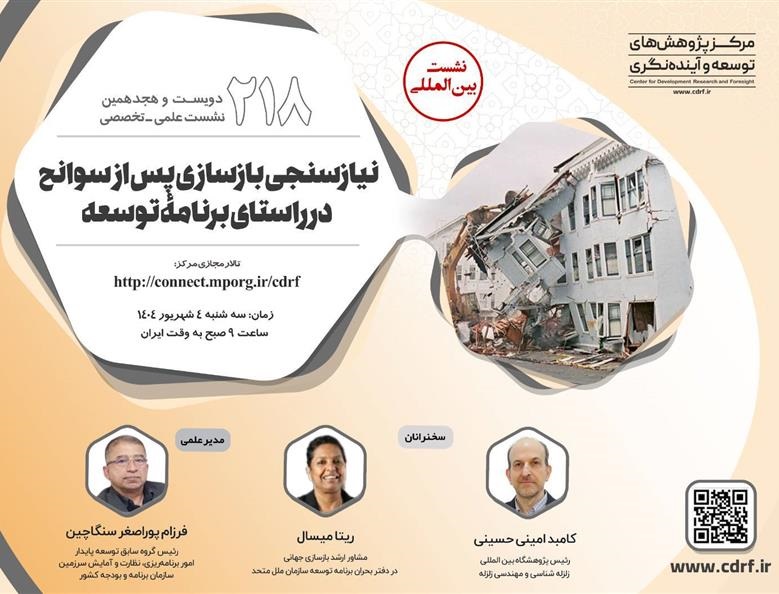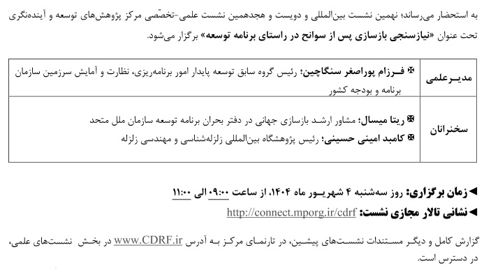 نشست علمی نیاز سنجی بازسازی سوانح در راستای برنامه توسعه ۰۳ شهریور ۱۴۰۴ | ۱۲:۳۷ کد : ۵۴۰۰۰ اطلاعیه ارسال به دیگران نام شما ایمیل شما ایمیل دریافتکننده ارسال انصراف تعداد بازدید:۱۶۲۷ نشست علمی نیاز سنجی بازسازی سوانح در راستای برنامه توسعه، توسط مرکز پژوهش های توسعه و آینده نگری برگزار می گردد.